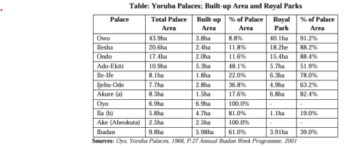 According to Oluremi I. Obateru (2006), the palaces of Oyo built in 1839 covering 6.9 hectares and that of Abeokuta around 1830 are products of the civil strife. This is why they are relatively small in size; they also lack royal parks of Old Oyo and Owu covering about 259 hectares. The present day sizes of Yoruba palaces are: Ife total palace area cover about 8.1 hectares, Ijebu-Ode about 7.7 hectares; Akure about 8.3 hectares; Oyo about 6.9 hectares; Ila 5.8 hectares, Abeokuta (Ake) about 2.5 hectares. Out of these palaces, Oyo and Ake are fully built while others have Royal Parks of 78% for Ife; 63.2% for Ijebu-Ode; 82.4% for Akure; and 19.0% for Ila (Ojo, Yoruba Palaces, 1966, P. 27). Thus, of all the Yoruba Palaces, that of he present Oyo, 6.9 hectares, has the largest built-up area. However, the New Olubadan Palace has an area of 9.89 hectares with a built up are of 5.98 hectares, while the old Irefin palace in Ibadan was built on 4.0 Acres of land.