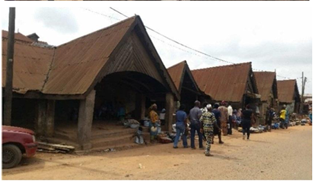 Àfin Irefin was built in the year 1910 on about 4 acres of land. It is an elaborate structure with 62 rooms contrary to 125 mentioned by the Oyo state government [14]. The four acre palace is bounded by Irefin oje road and Oke adu road. Today Àfin Irefin has lost most part of the palace grounds to remain only the palace structure. The palace structure constitutes four zones surrounding four courtyards with the largest measuring about 300sqm. It is situated on a hill top that allows a good view of surrounding landscape of Ibadan from the roof terrace. Bounded by Irefin Oje road by the side and the main entrance (Figure 1). Irefin Oje road can be accessed either through two major roads – Bashorun gate or oke adu road. The main entrance consists of five gable porches that serves as a market place (Figure 2). The market is in line with Yorùbá culture where the king’s market is before the palace. A position that further highlights the relationship between both institutions of authority where the market is a citadel of political power and the Oba is the Oloja and oversee all activity within it.